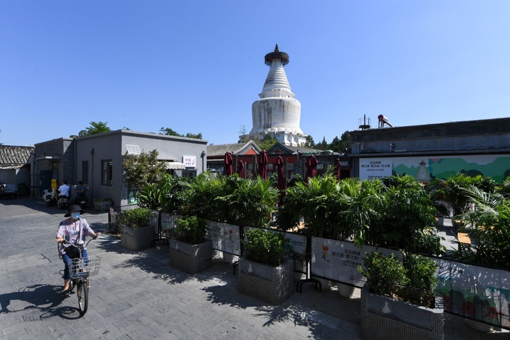 午后的北京西城區(qū)宮門口西岔胡同,居民們納涼聊天,一間間老字號(hào)燒餅店、特色咖啡廳、精釀啤酒館各成風(fēng)景。抬頭望去,青磚灰瓦與紅墻綠樹之上,妙應(yīng)寺白塔莊重滄桑,古樸與現(xiàn)代相映成趣。