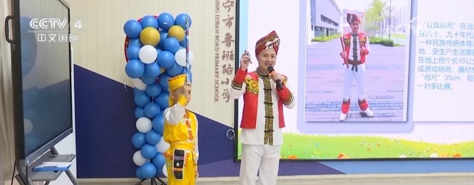 在南寧市魯班路小學(xué),同學(xué)們領(lǐng)略了獨(dú)具壯族特色的體育活動(dòng)《迪尺小課堂》。同學(xué)們還在開(kāi)學(xué)典禮上身穿自己設(shè)計(jì)制作的扎染服飾,手拿親手制作的紅陶、皮影等非遺作品,表演了一場(chǎng)非遺秀。