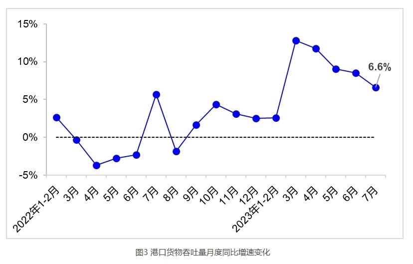 7月,全國(guó)港口完成貨物吞吐量14.3億噸,同比增長(zhǎng)6.6%,其中內(nèi)、外貿(mào)吞吐量分別增長(zhǎng)5.8%和8.5%。完成集裝箱吞吐量2705萬(wàn)標(biāo)箱,同比增長(zhǎng)2.6%。