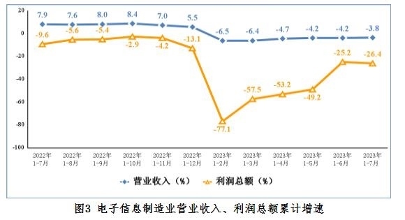 1—7月份,規(guī)模以上電子信息制造業(yè)實(shí)現(xiàn)營業(yè)收入7.98萬億元,同比下降3.8%,較上半年降幅收窄0.4個(gè)百分點(diǎn);營業(yè)成本6.98萬億元,同比下降3.3%;實(shí)現(xiàn)利潤總額2763億元,同比下降26.4%,較上半年降幅加深1.2個(gè)百分點(diǎn);營業(yè)收入利潤率為3.5%,較上半年下降0.1個(gè)百分點(diǎn)。