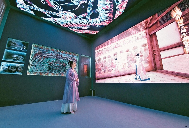 圖為2023年6月8日,一名身著傳統(tǒng)服飾的觀眾在第十九屆中國(深圳)國際文化產(chǎn)業(yè)博覽交易會甘肅展臺觀看數(shù)字敦煌展覽。 新華社記者 梁旭/攝