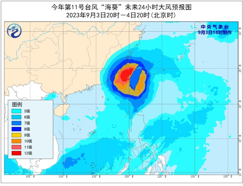 大風(fēng)預(yù)報(bào):9月3日20時(shí)至4日20時(shí),巴士海峽、臺(tái)灣海峽、臺(tái)灣以東洋面、東海南部及釣魚島附近海域、南海東北部以及浙江南部沿海、福建沿海、廣東東部偏東地區(qū)沿海、臺(tái)灣島及沿海將有6-8級(jí)、陣風(fēng)9-10級(jí)大風(fēng),部分海域或地區(qū)的風(fēng)力有9-12級(jí),陣風(fēng)13-14級(jí),“??敝行慕?jīng)過的附近海面或地區(qū)的風(fēng)力有13-14級(jí),陣風(fēng)15級(jí)。