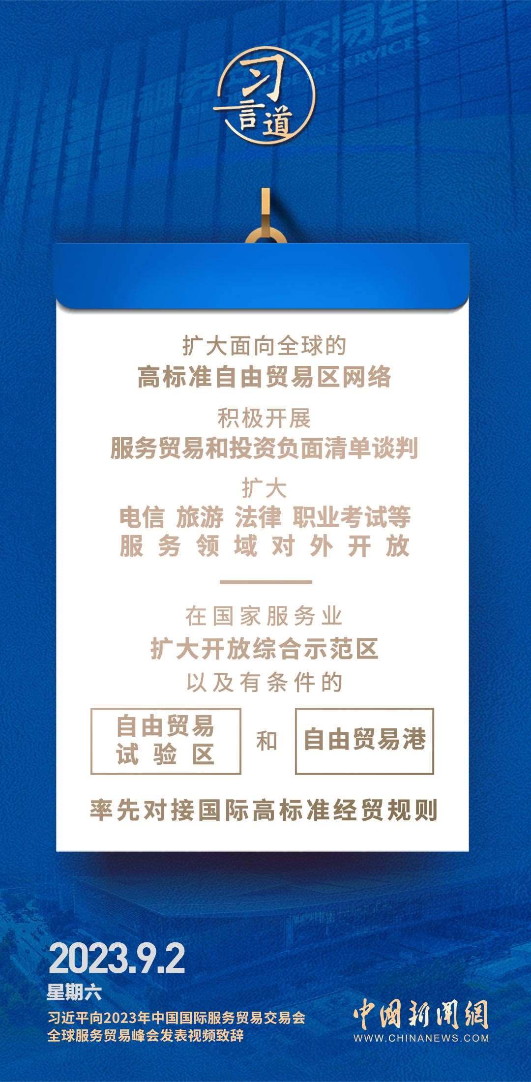 9月2日上午,國(guó)家主席習(xí)近平在北京向2023年中國(guó)國(guó)際服務(wù)貿(mào)易交易會(huì)全球服務(wù)貿(mào)易峰會(huì)發(fā)表視頻致辭。習(xí)近平指出——