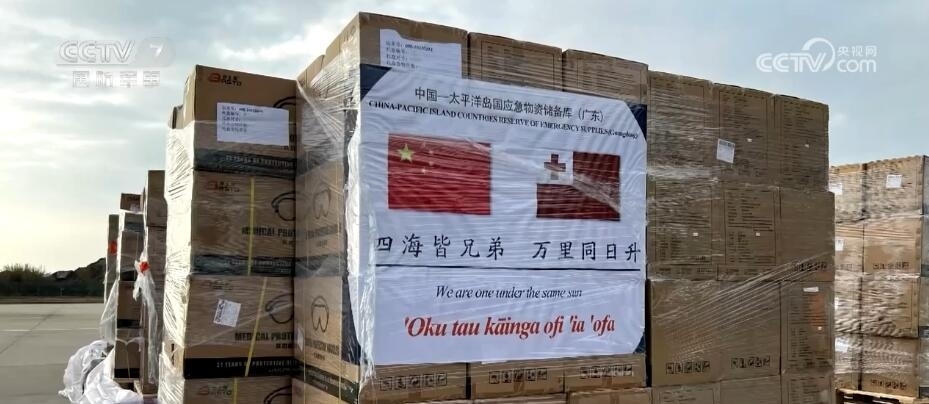 空軍航空兵某團(tuán) 楊樹帥:當(dāng)時(shí)我們集裝的貨物上都印有一面中國國旗和(一面)湯加國旗,并印了一句中國古詩“四海皆兄弟,萬里同日升”。