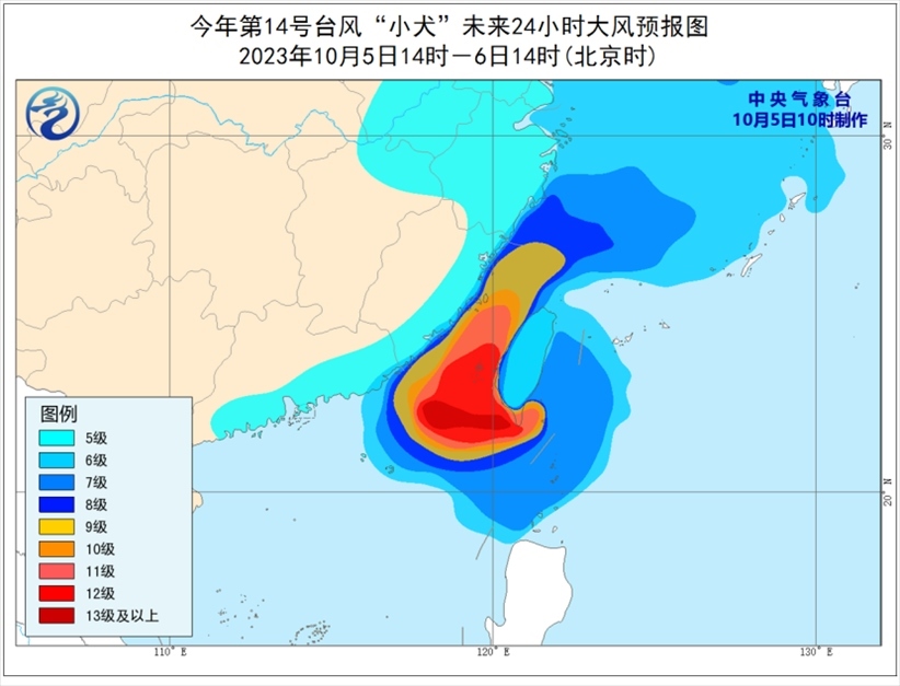 大風(fēng)預(yù)報(bào):5日14時(shí)至6日14時(shí),東海大部及釣魚島附近海域、臺(tái)灣以東洋面、巴士海峽、臺(tái)灣海峽、南海東北部以及浙江沿海、福建沿海、廣東東部沿海、臺(tái)灣島沿海將有6-8級(jí)、陣風(fēng)9-10級(jí)的大風(fēng),其中巴士海峽北部海面、臺(tái)灣海峽、臺(tái)灣島南部及沿海風(fēng)力將有9-12級(jí)、陣風(fēng)12-13級(jí),“小犬”中心經(jīng)過的附近海面風(fēng)力可達(dá)13-14級(jí),陣風(fēng)15-16級(jí)。