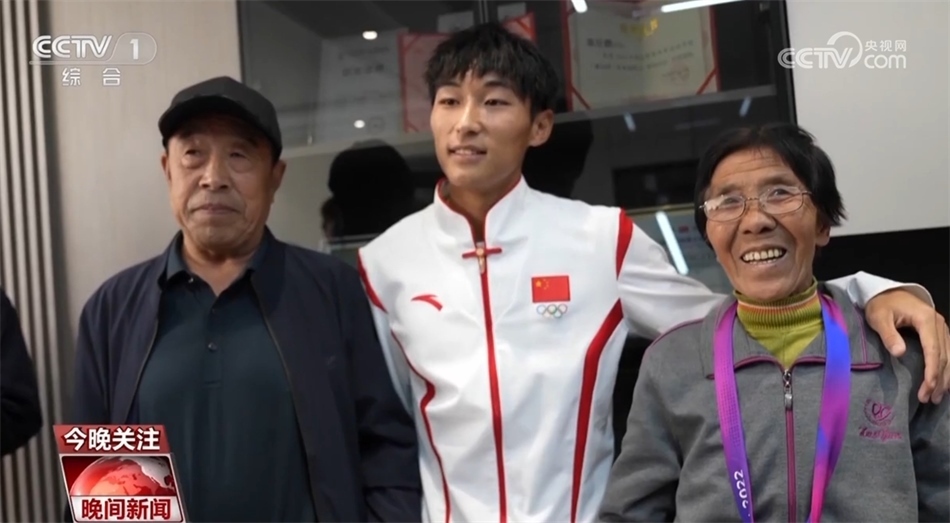 田徑比賽男子4×100米接力決賽中,第四棒陳佳鵬接棒時(shí),中國隊(duì)稍微落后。憑借強(qiáng)大的后程加速能力,陳佳鵬在最后30米逆轉(zhuǎn)對手率先撞線,中國隊(duì)收獲金牌。奪冠后陳佳鵬回到老家,先后把金牌掛在了媽媽和奶奶的脖子上,合影時(shí)奶奶笑得合不攏嘴。