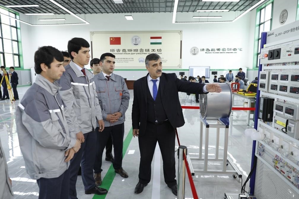 4月12日,在塔吉克斯坦首都杜尚別的魯班工坊內(nèi),塔方教授向?qū)W生講解綠色電能展示平臺(tái)的功能與使用方法。新華社發(fā)(奧斯帕諾夫攝)