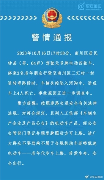 ·重慶警方通報(bào):老人駕駛無牌電動(dòng)四輪車搭載3名老年朋友失控墜河,4人死亡。