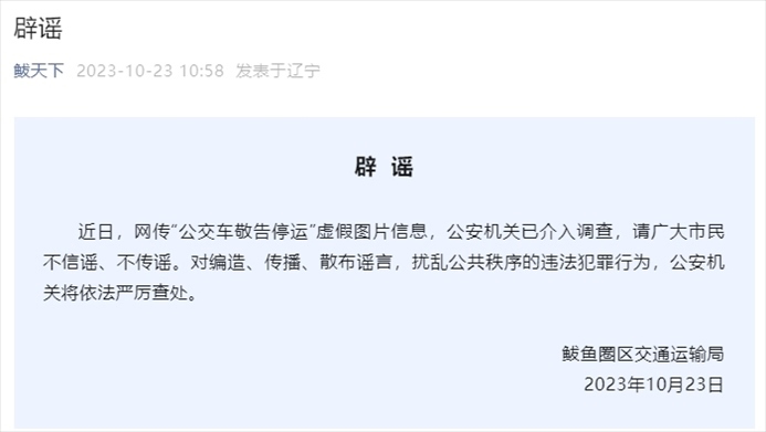 ·網(wǎng)傳“公交車敬告停運(yùn)”,遼寧營口鲅魚圈區(qū)交通運(yùn)輸局辟謠:系虛假圖片,公安已介入。