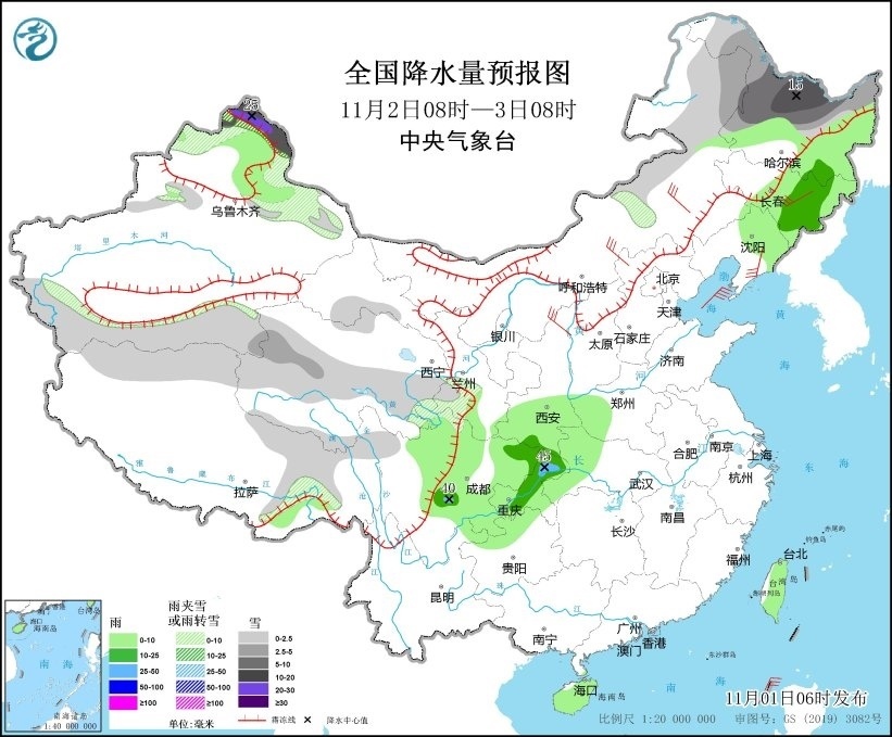 11月2日08時至3日08時,內(nèi)蒙古東部、黑龍江中北部、新疆北部和南疆盆地南部、西藏北部和東部、青海南部、甘肅西南部等地部分地區(qū)有小到中雪或雨夾雪,其中,新疆阿勒泰北部、黑龍江西北部等地部分地區(qū)有大到暴雪,局地大暴雪(20~25毫米);黑龍江東部、吉林中東部、遼寧北部、陜西南部、四川中東部、重慶、貴州北部、湖北西部、河南西部、海南島、臺灣島等地部分地區(qū)有小到中雨,其中,四川中部、重慶東北部等地局地有大雨(25~45毫米)。內(nèi)蒙古中東部、吉林中部、遼寧東部、陜西北部等地部分地區(qū)有5~6級風(fēng)(見圖2)。