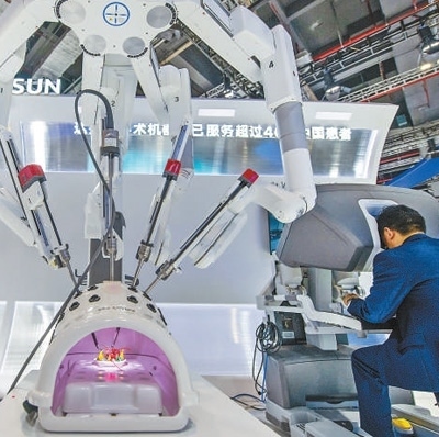 在醫(yī)療器械及醫(yī)藥保健展區(qū),參觀者正在體驗(yàn)操作復(fù)星醫(yī)藥首臺國產(chǎn)“達(dá)芬奇Xi手術(shù)系統(tǒng)”。人民網(wǎng)記者 翁奇羽攝