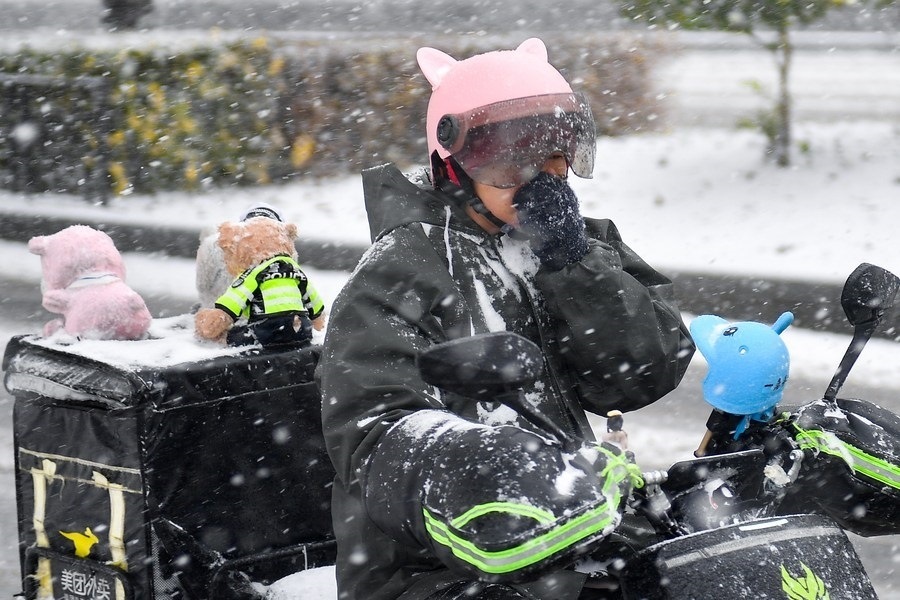 11月6日,外賣員在長春市延安大街上冒雪配送外賣。新華社記者 顏麟蘊(yùn) 攝