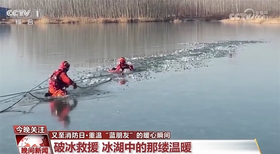 這是在今年年初,冒著凜冽刺骨的低溫,匍匐前進(jìn)的消防員正在接近落冰者,冰水的浸泡已經(jīng)使落冰者失去了自主行動(dòng)的能力,只能靠消防員拖拽向前。