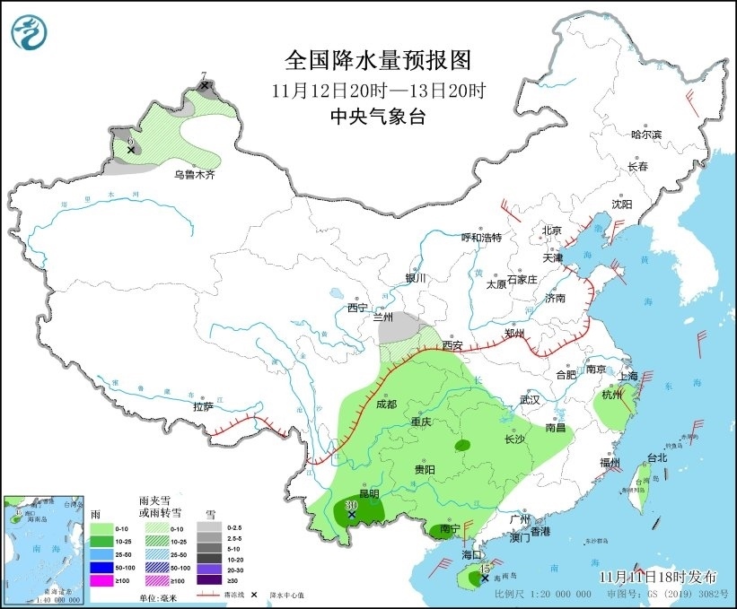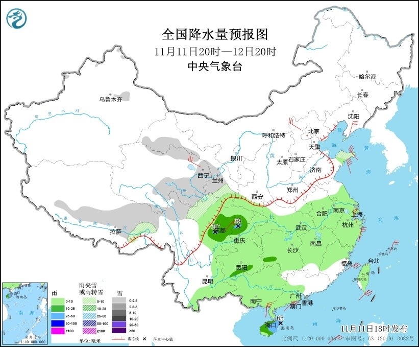 11月11日20時至12日20時,新疆沿天山地區(qū)、西藏中部和東部、青海北部和東南部、甘肅中南部和河西、山東半島、川西高原北部等地部分地區(qū)有小雪或雨夾雪。四川盆地、貴州南部、湖南西南部、海南島等地部分地區(qū)有中到大雨,局地有暴雨(50~65毫米)。遼東半島、青海北部、河北北部、山東半島、四川盆地中部、浙江東部等地部分地區(qū)有5~6級風(fēng)。東海南部、臺灣海峽、臺灣以東洋面、巴士海峽、南海北部和中部、北部灣有7~8級、陣風(fēng)9級的大風(fēng)(見圖4)。