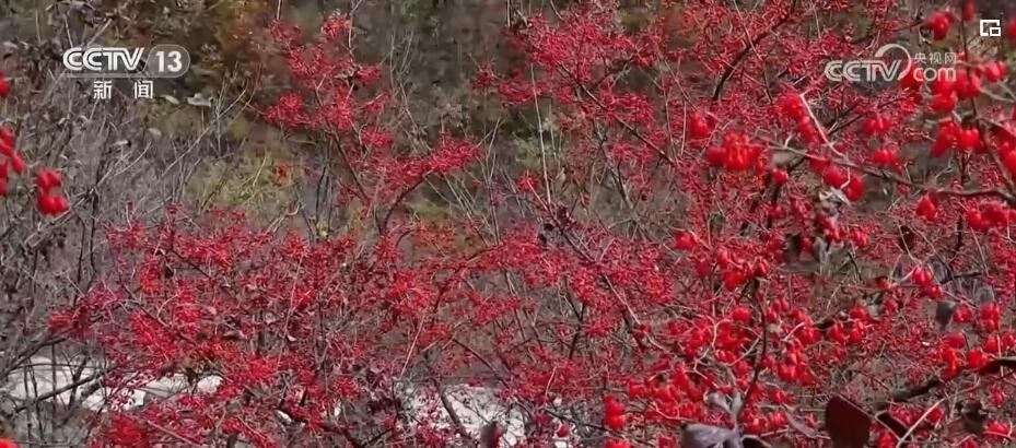 山林間,成片的山茱萸樹在褪去枯葉后,紅彤彤的果實便顯露出來,密密麻麻綴滿枝頭。種植戶們穿梭林間,忙著采摘。