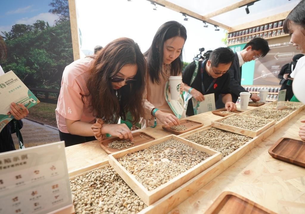 9月19日,在星巴克中國(guó)咖啡創(chuàng)新產(chǎn)業(yè)園開(kāi)園儀式現(xiàn)場(chǎng),來(lái)賓在體驗(yàn)挑揀咖啡生豆。當(dāng)日,星巴克中國(guó)咖啡創(chuàng)新產(chǎn)業(yè)園在江蘇昆山落成投產(chǎn)。