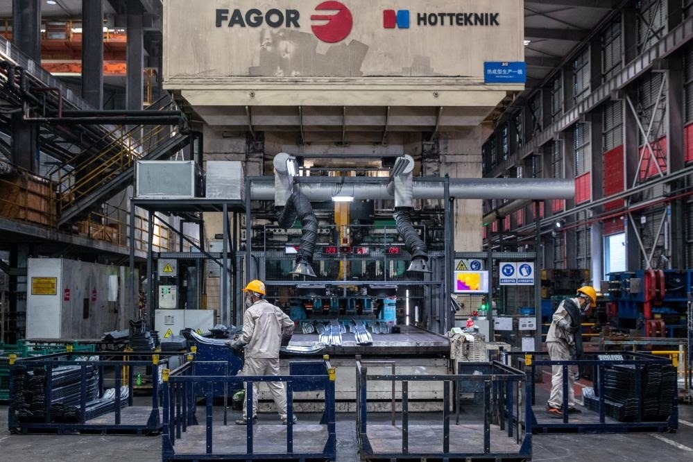 在位于重慶市兩江新區(qū)的一家機(jī)械設(shè)備生產(chǎn)企業(yè)的熱壓車間,工人將剛下線的零件裝箱(2023年7月16日攝)。新華社記者儲(chǔ)加音攝
