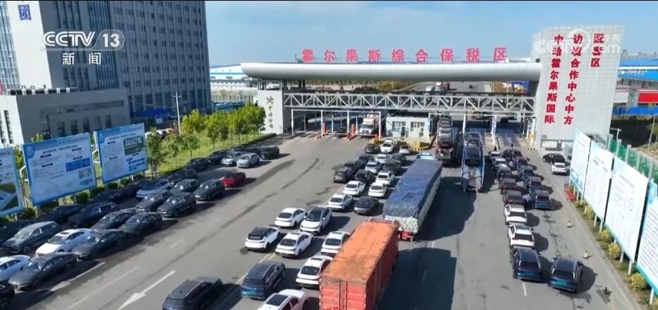 總臺記者 崔寧:看我的腳下,這邊是中國的土地,這邊是哈薩克斯坦的土地。人們在這里可以一腳踏兩國,自由地往來出入,不僅可以旅游購物、貿(mào)易洽談,還能享受免稅政策。