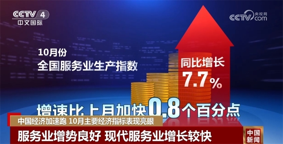 再來看服務(wù)業(yè)。服務(wù)業(yè)增勢良好,現(xiàn)代服務(wù)業(yè)增長較快。10月份,服務(wù)業(yè)生產(chǎn)指數(shù)同比增長7.7%,比上月加快0.8個百分點(diǎn)。其中,住宿和餐飲業(yè)、批發(fā)和零售業(yè)、交通運(yùn)輸倉儲和郵政業(yè)等聚集型服務(wù)業(yè)都保持兩位數(shù)增長。