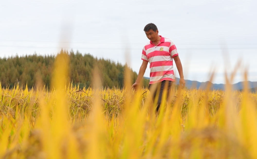 在遼寧省撫順市新賓滿族自治縣新賓鎮(zhèn)的稻田里,農(nóng)民查看水稻成熟情況(2023年9月25日攝)。新華社記者 楊青 攝