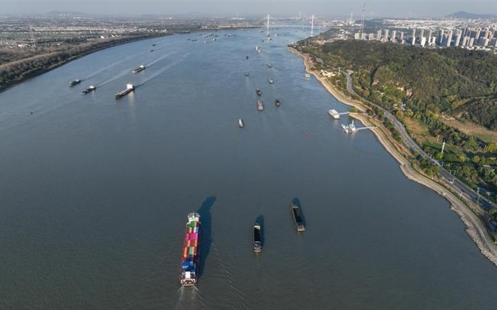 船只行駛在長江南京段(11月2日攝,無人機照片)。記者 季春鵬 攝