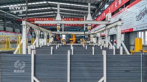 王輝:“通過(guò)手機(jī)掃描能夠數(shù)字化顯示鋼筋所有的生產(chǎn)信息,鋼筋智能生產(chǎn)的設(shè)備把原材料鋼筋做成單元件,通過(guò)這個(gè)設(shè)備的組裝形成了鋼筋片體。像這樣的片體5號(hào)塔要用3萬(wàn)個(gè),大概分成了3200組,每一組鋼筋用的部位都不一樣,為了精準(zhǔn)識(shí)別它用在哪里,每一組要給它一個(gè)識(shí)別信息,做一個(gè)二維碼,通過(guò)手機(jī)掃描就可以知道它要用在哪個(gè)地方?!?/p>