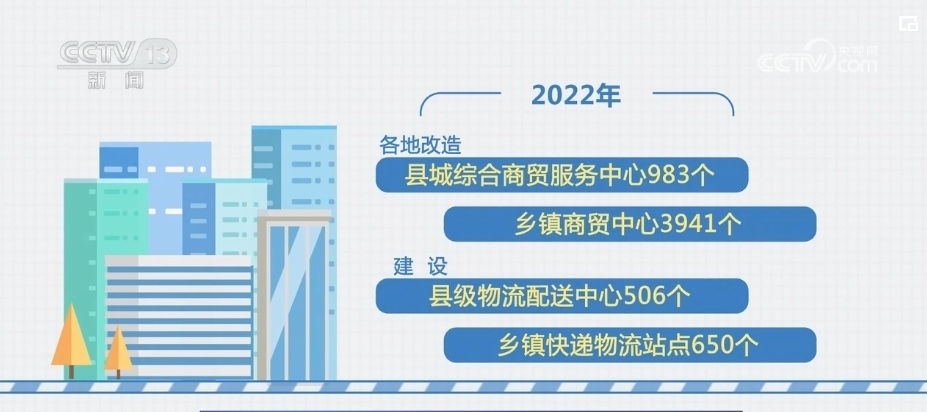 2022年,各地改造縣城綜合商貿(mào)服務(wù)中心983個、鄉(xiāng)鎮(zhèn)商貿(mào)中心3941個,建設(shè)縣級物流配送中心506個、鄉(xiāng)鎮(zhèn)快遞物流站點(diǎn)650個。