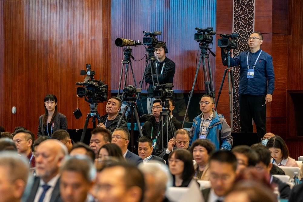 2023年12月5日,記者在云南昆明采訪第五屆世界媒體峰會(huì)(云南分會(huì)場(chǎng))暨第二屆大象國(guó)際傳播論壇開幕式。新華社記者 胡超 攝