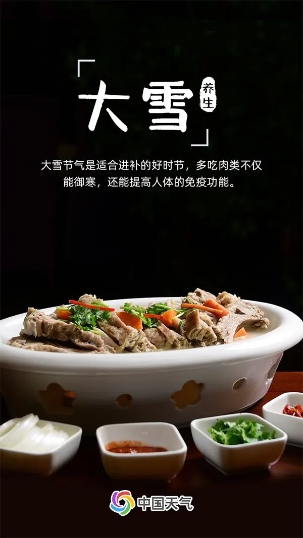 大雪也是適合進(jìn)補(bǔ)的好時節(jié)。冬天的寒冷為放肆吃肉提供了充足的理由,肉類不僅能為我們的身體提供足夠的熱量以抵御嚴(yán)寒,還能提高人體的免疫功能,促進(jìn)新陳代謝。不過,進(jìn)補(bǔ)也要有“度”,除了吃肉,也要適當(dāng)吃一些新鮮的水果和蔬菜,做到營養(yǎng)均衡。
