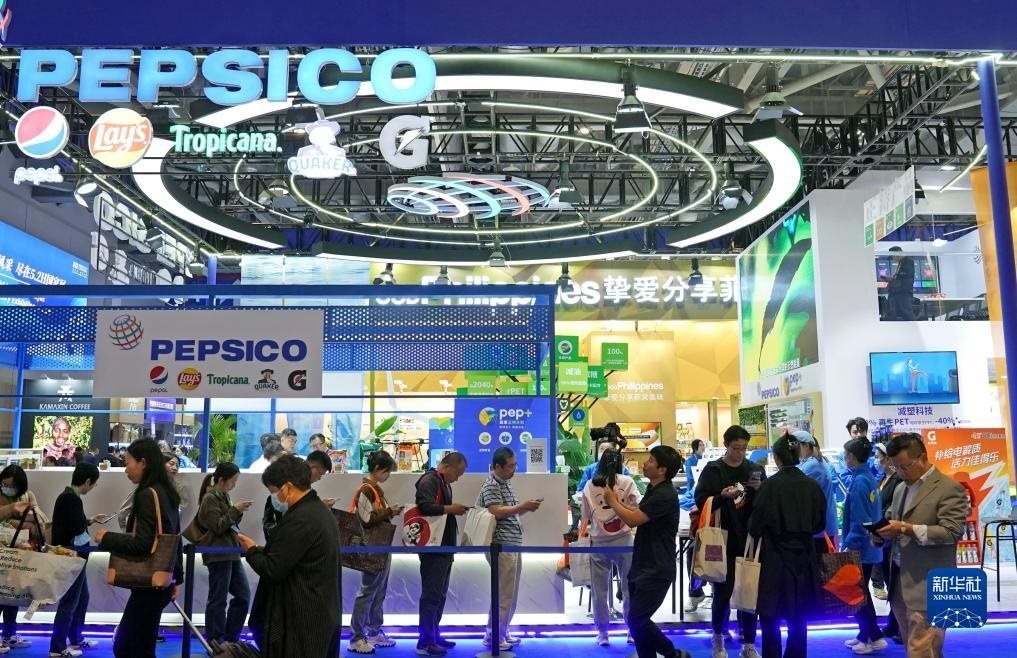 2023年11月8日在第六屆進(jìn)博會(huì)食品及農(nóng)產(chǎn)品展區(qū)拍攝的百事公司展臺(tái)。今年是百事公司首次參展進(jìn)博會(huì)。新華社記者 劉穎 攝