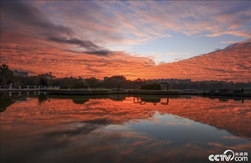 2023年12月7日清晨,云南曲靖上空出現(xiàn)火燒云景觀(guān)。