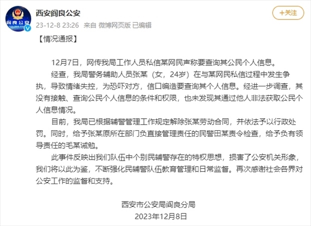 ·西安閻良公安通報(bào)警務(wù)輔助人員稱(chēng)要查網(wǎng)友個(gè)人信息:解除勞動(dòng)合同,予以行政處罰。