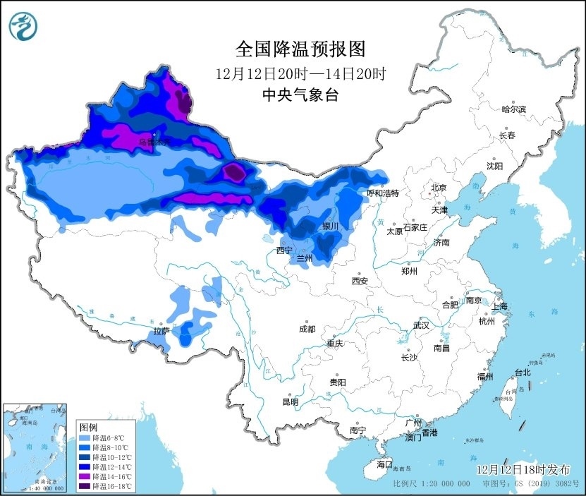 其中,12月12日20時至12月14日20時,新疆、內蒙古西部、甘肅、寧夏等地將出現(xiàn)8~12℃降溫,新疆北部、甘肅西部局地降溫可達14℃以上。
