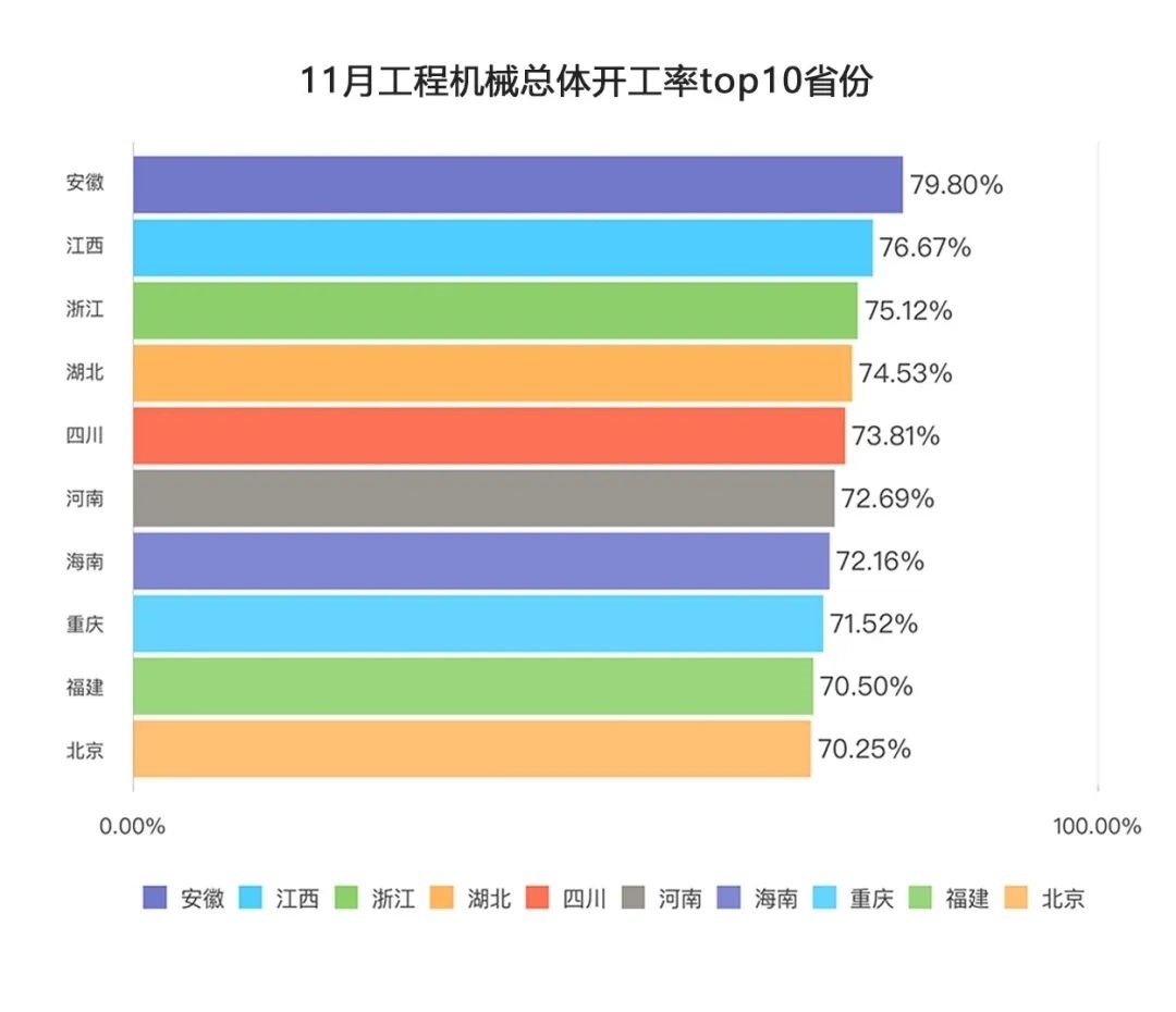 11月,安徽、河南、湖北各有7類設(shè)備平均作業(yè)量同比增長(zhǎng),江西有3類設(shè)備平均作業(yè)量同比增長(zhǎng),主要集中在汽車起重機(jī)、履帶起重機(jī)、挖掘機(jī)。