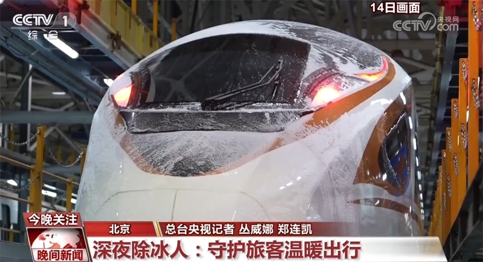 持續(xù)的雨雪冰凍天氣不僅影響公路安全,也對高鐵動車運(yùn)行造成一定影響。晚上11點(diǎn),在北京西和雄安站間運(yùn)行一天的C2727次列車完成任務(wù),入庫檢修,車頭上頂著厚厚的冰塊。