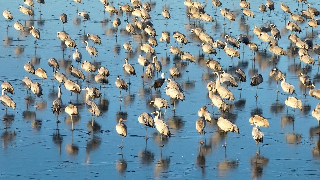 鶴群聚集在衡水湖“冰雪大舞臺(tái)”上。
