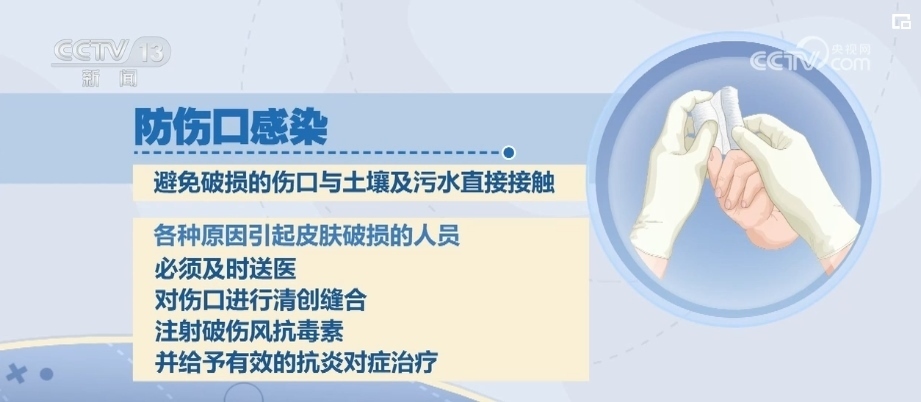 如果有受傷的情況,應(yīng)避免破損的傷口與土壤及污水直接接觸。各種原因引起皮膚破損的人員必須及時送醫(yī),對傷口進(jìn)行清創(chuàng)縫合、注射破傷風(fēng)抗毒素,并給予有效的抗炎對癥治療。