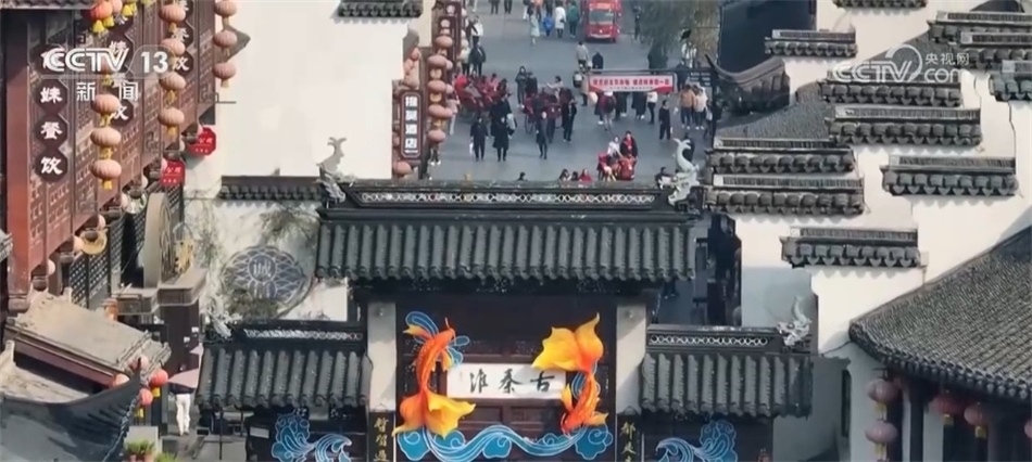 ??????新年將至,南京秦淮河畔的各式花燈陸續(xù)落成,與古建筑相互映襯。碧水繞城,畫舫穿行,裝扮后的古城如畫如詩。在“古秦淮”的牌坊上,魚躍龍門的造型立體生動(dòng)。人們穿過牌坊,采買年貨,拍照留念。在夫子廟南側(cè)的門東歷史文化街區(qū),一條大龍?jiān)煨偷幕粢莱菈Χ?。十二生肖燈組活靈活現(xiàn),讓古樸的街巷增添了迎新的色彩。