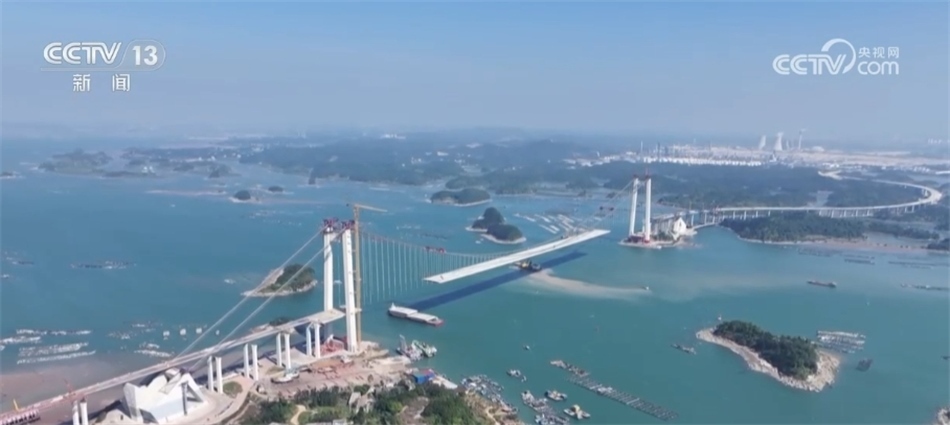 ??????這里是廣西欽州市的龍門大橋,從空中俯瞰,建設(shè)中的龍門大橋宛若一條巨龍橫臥于碧海之上。龍門大橋全長7.6公里,是目前廣西在建的最長跨海大橋。通車后,防城港與欽州港的時(shí)空距離由原來的1.5小時(shí)縮減至25分鐘左右,助力西部陸海新通道建設(shè)。