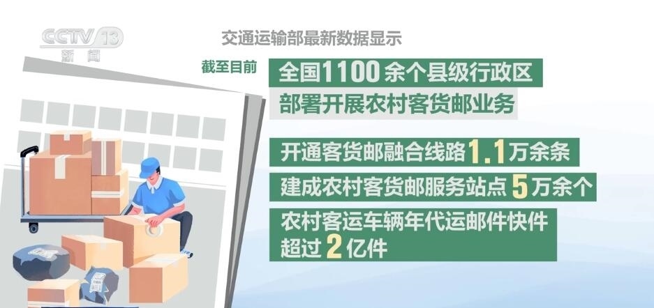 交通運(yùn)輸部最新數(shù)據(jù)顯示,截至目前,全國1100余個縣級行政區(qū)部署開展農(nóng)村客貨郵業(yè)務(wù),開通客貨郵融合線路1.1萬余條,建成農(nóng)村客貨郵服務(wù)站點(diǎn)5萬余個,農(nóng)村客運(yùn)車輛年代運(yùn)郵件快件超過2億件。