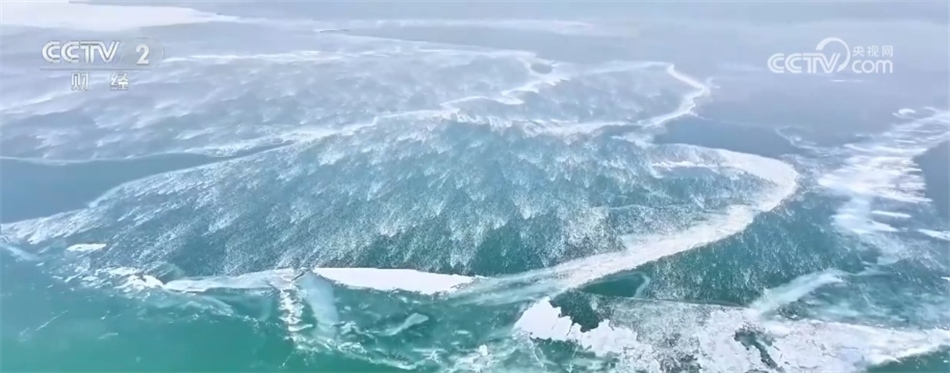 從空中俯瞰,金色的沙灘、潔白的冰線、剔透的碎冰以及蔚藍的湖面,共同構成一幅色彩明艷的線條畫。