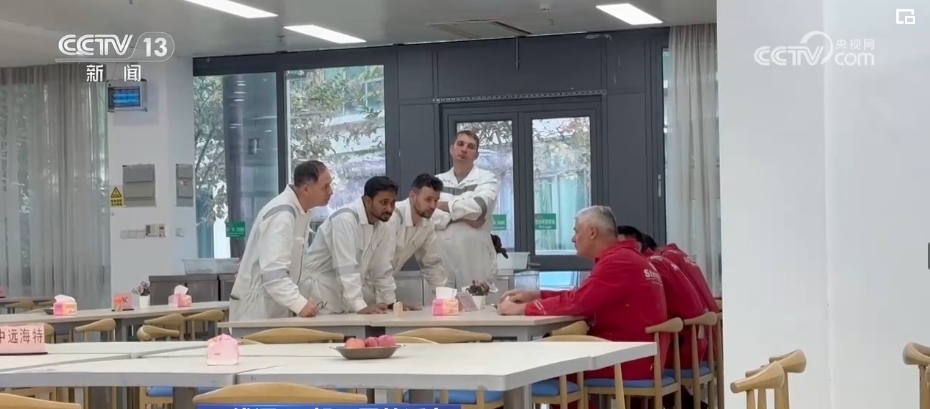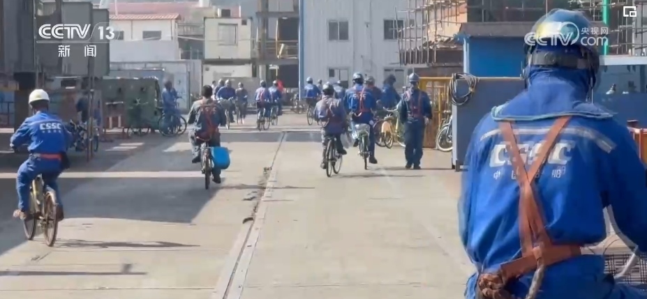 一輛輛各式各樣的自行車平穩(wěn)穿梭在安全區(qū),車上的工友有事兒就會(huì)互相召喚,拿出圖紙解決問題,互通有無。而在職工和船東餐廳里,一張張餐桌上分區(qū)標(biāo)記了各個(gè)業(yè)主單位。吃完飯撤掉餐具,大家就開始“頭腦風(fēng)暴”,現(xiàn)場辦公。