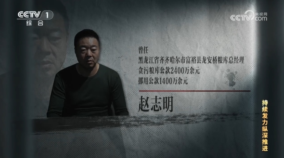 【解說詞】趙志明曾是黑龍江省齊齊哈爾市富??h龍安橋糧庫總經(jīng)理,經(jīng)查,他貪污糧庫公款2400萬余元,挪用公款1400萬余元,2023年3月被判處有期徒刑14年。龍安橋糧庫是在2015年由5家國有糧庫改革重組的,富裕縣政府持股51%、民營企業(yè)鼎倉公司持股49%。趙志明原本是鼎倉公司的老板,在這次改制中當上了龍安橋糧庫總經(jīng)理。