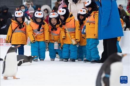 1月6日,在哈爾濱極地公園,“小砂糖橘”與企鵝進行互動。新華社記者 張濤 攝