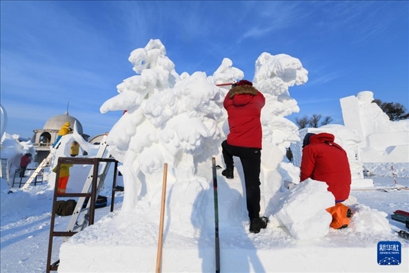 1月8日,選手在太陽島雪博會園區(qū)內制作雪雕。新華社記者 王松 攝