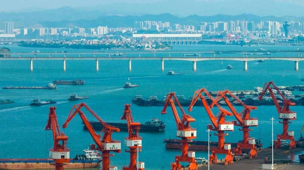 1月3日,在廣西梧州臨港經(jīng)濟(jì)區(qū)赤水港碼頭,工人操作設(shè)備在碼頭上進(jìn)行裝卸作業(yè)(無(wú)人機(jī)照片)。新華社發(fā)(何華文攝)