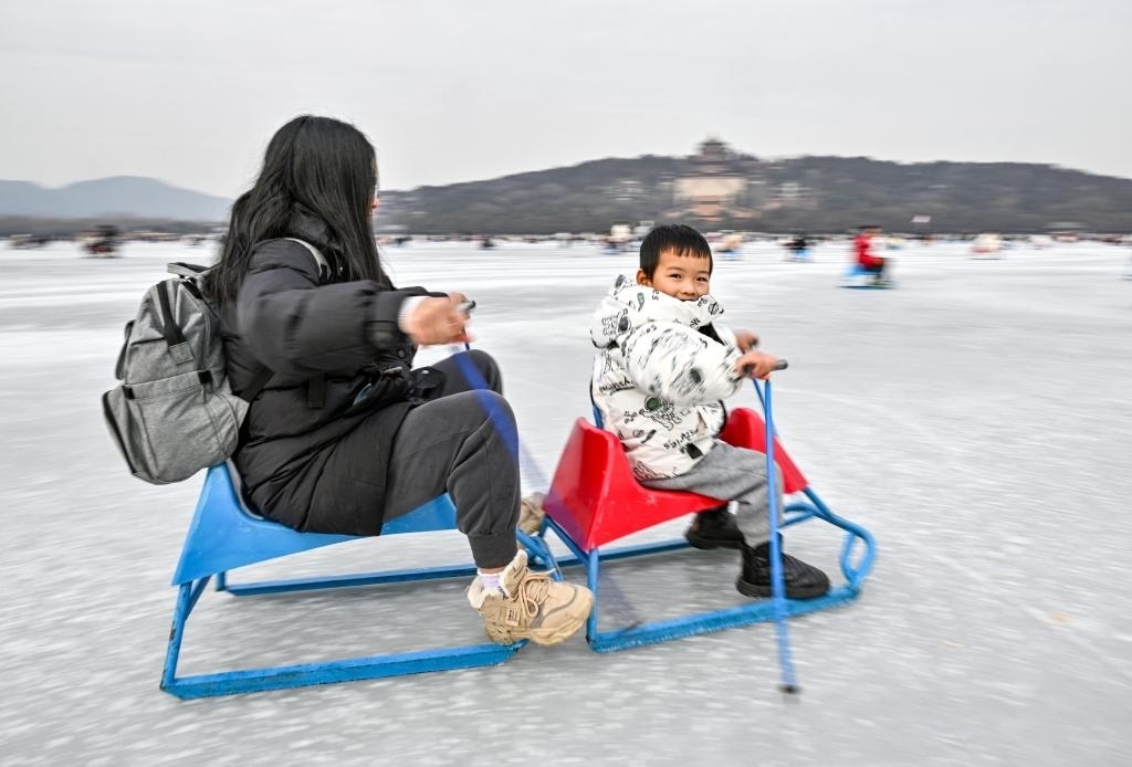 1月1日,游客在頤和園冰場(chǎng)玩冰車。新華社記者 陳曄華 攝