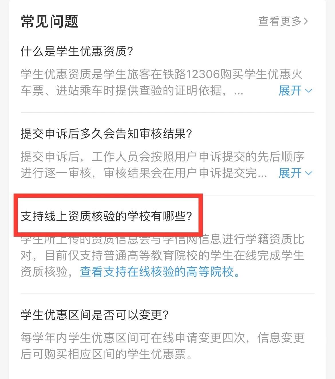 打開鐵路12306App,右下角進(jìn)入“我的”頁面,在學(xué)生資質(zhì)填寫頁面的“常見問題”中,找到“支持線上資質(zhì)核驗的學(xué)校有哪些?”即可查看支持在線核驗的學(xué)校名單。