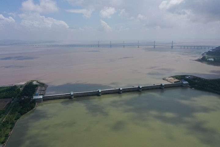 曹娥江大閘是我國(guó)強(qiáng)涌潮河口地區(qū)第一大閘,浙東水資源配置重要樞紐工程(2023年8月4日攝,無(wú)人機(jī)照片)。新華社記者 黃宗治 攝