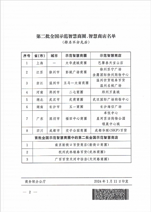 央視網(wǎng)消息:據(jù)商務(wù)部網(wǎng)站消息,商務(wù)部發(fā)布關(guān)于公布第二批全國(guó)示范智慧商圈、智慧商店名單的通知,認(rèn)定8個(gè)商圈、15個(gè)商店為第二批“全國(guó)示范智慧商圈”、“全國(guó)示范智慧商店”。